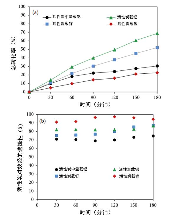 圖3:在120℃的氫中預處理的幾種活性炭催化劑的總轉化率(a)和炔烴(b)對時間的選擇性。
