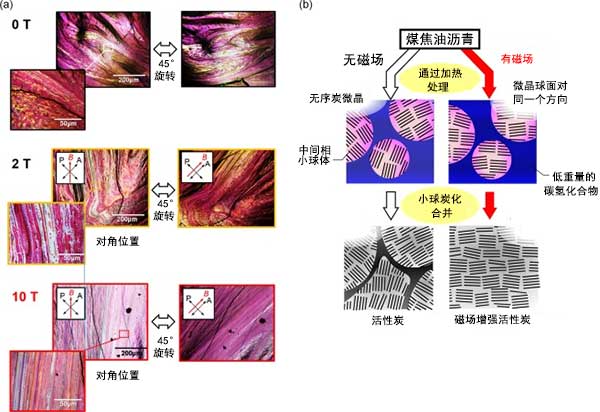 圖2:(a)在沒有和存在2T和10T的磁場的情況下制備的活性炭前體材料的偏振顯微鏡圖像。(b)對煤焦油瀝青的碳化過程的磁場效應的示意圖。