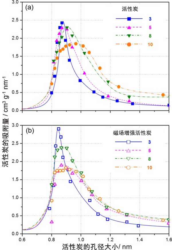 從煤焦油和瀝青制備活性炭的微孔分布,從所獲得的吸附等溫線,在圖3兩種活性炭的孔徑差異非常小相差不到0.04nm,并且在兩種情況下大多數孔分布在0.80和0.95nm之間。然而,觀察到由磁場增強過的活性炭吸附量在該區域中大大增加。從吸附等溫線可以估計0.8至0.95nm范圍內的總吸附量約為1.25倍。當活化劑量加大時兩種活性炭的孔徑分布均發生變化,產生了略大的孔隙結構。