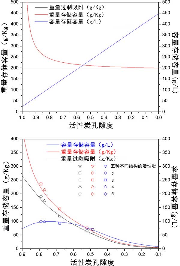 圖4顯示了兩種活性炭的重量和體積存儲容量之間的相互依賴性。實驗吸附測量與第二模型一致,將孔隙率和表面積作為因變量處理。經(jīng)過對比活性炭樣品的實驗性過量吸附,重量儲存容量和體積儲存容量。圖3和圖4將理論模型與實驗數(shù)據(jù)進行比較。它表明,所開發(fā)的模型是通用的,并預(yù)測任何活性炭樣品的重量和體積儲存容量之間的相互依賴性。結(jié)果也適用于金屬有機骨架。雖然實驗結(jié)果比較好的活性炭不具有較高的表面積,但孔隙率在0.65和0.75之間。通過使用化學(xué)粘合劑將活性炭粉末壓縮成整料,實現(xiàn)了更高的體積儲存容量。整體的體積儲存容量使用整體式整體密度而不是活性炭的表觀密度或金屬有機框架材料的單晶密度來計算。