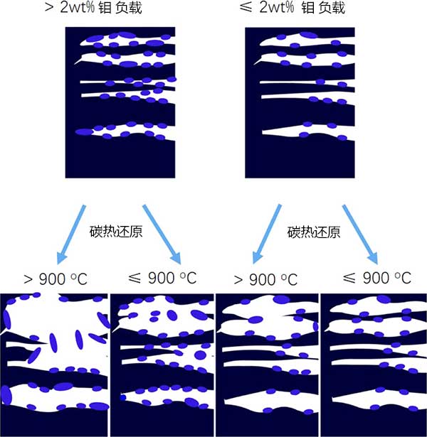 圖4:具有不同鉬負載和碳熱還原溫度的活性炭的孔發展過程圖。