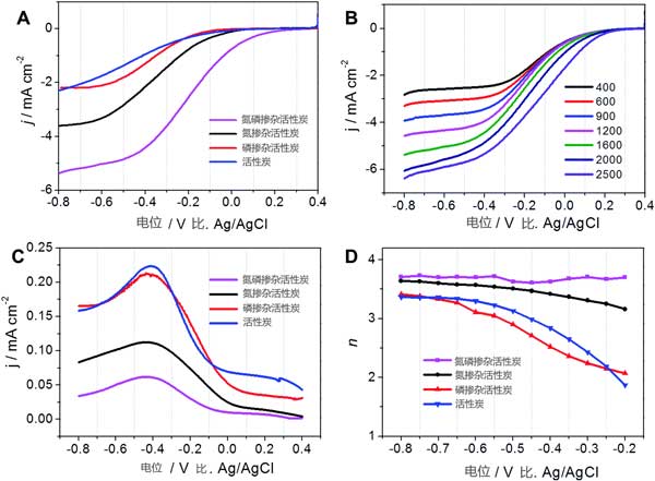 活性炭樣品通過兩步法制備,包括原位氧化聚合和高溫?zé)峤狻_@里,苯胺和植酸分別用作氮源和磷源。為了研究氮磷碳比對活性炭的氧化還原電催化活性的影響,在中性介質(zhì)中進行循環(huán)伏安圖。旋轉(zhuǎn)圓盤電極伏安圖在氧飽和的50mM磷酸鹽緩沖溶液中進行,結(jié)果顯示在圖2A中。在摻雜碳改性后,活性炭基催化劑的起始電位顯示出從0V到+0.22V的大的正向偏移,氧化還原電流密度也大大增加。此外,由共摻雜碳改性的活性炭電催化活性優(yōu)于由單摻雜碳改性的活性炭電催化活性。在進行旋轉(zhuǎn)環(huán)盤電極測量以研究不同催化劑的過氧化氫的產(chǎn)生(圖2C)。正如預(yù)期的那樣,氮磷摻雜活性炭顯示出比其他催化劑更低的過氧化氫產(chǎn)生。可以看出,氮磷摻雜活性炭在氧化還原起始電位和高電流電流方面對氧化還原具有優(yōu)異的電催化活性,突出了N,P共摻雜和中孔結(jié)構(gòu)對氧化還原的重要性。