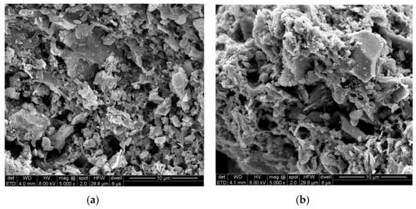 圖2:(a)化學活化和(b)物理活化的活性炭掃描電子顯微鏡(SEM)圖像。