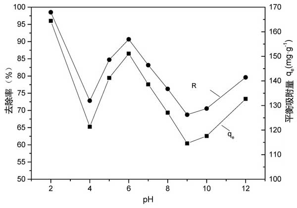 pH對活性炭吸附鉻黑T的影響:用3.00g·L-1活性炭懸浮于含有500mg·L-1鉻黑T的50mL溶液的8個燒杯中進行pH效應實驗,pH設定為2.0-12.0。將混合物在25℃的溫度下在振蕩器上平衡48小時。吸附后,用孔徑為0.45μm的聚醚砜膜過濾混合物,測定鉻黑T水溶液濃度。根據結果,我們確定了合適的pH值。