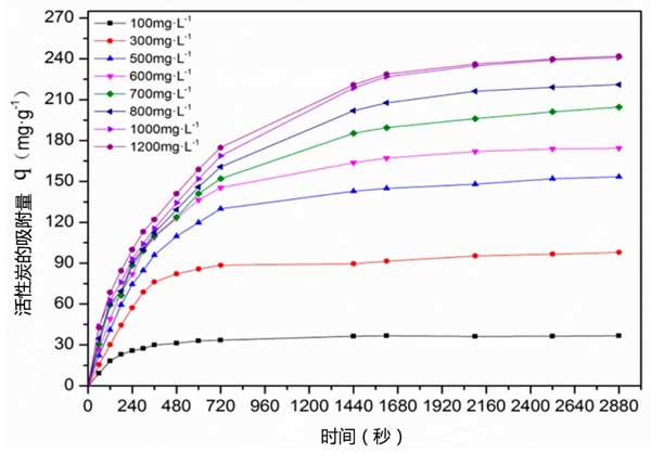 初始鉻黑T濃度對活性炭吸附的影響:用一系列鉻黑T水溶液(濃度:100.0-1200.0mg·L-1,體積:50mL)進行初始鉻黑T濃度效應實驗。將溶液的pH調節至合適,然后將溶液加入3.00g·L-1活性炭中,并將混合物在25℃的溫度下在振蕩器上平衡48小時,定期取水樣,測量鉻黑T水溶液的濃度,并計算吸附的鉻黑T量。