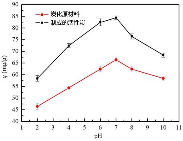 pH值的影響:吸附研究中最重要的因素之一是培養(yǎng)基pH的影響。根據(jù)吸附劑的用途,不同的物質(zhì)表現(xiàn)出不同的pH范圍。pH值對活性炭平衡吸附柴油的影響如圖3所示。當(dāng)吸附劑的pH值從2增加到10時,吸附劑用量,吸附劑溫度和接觸時間分別為0.2g,30℃和240秒。在酸性條件下,發(fā)現(xiàn)吸附容量隨pH增加而增加。當(dāng)pH為7時,吸附容量達(dá)到最大值。當(dāng)pH值繼續(xù)升高并且溶液系統(tǒng)變?yōu)閴A性時,吸附容量下降。這些結(jié)果表明,堿性和酸性環(huán)境不適合生物炭的吸附過程,活性炭吸附柴油的最佳pH值為7。這種變化可通過溶液中質(zhì)子數(shù)量的變化來解釋。和油乳液的穩(wěn)定性。強(qiáng)烈的酸性導(dǎo)致油脂聚結(jié),隨后增加油滴的大小。由于初始pH>7,由于酸性物質(zhì)的存在,柴油的溶解度增加,這使得柴油難以吸附在活性炭上。隨著初始pH的增加,過量的羥基離子和柴油競爭溶液中的活性吸附位點(diǎn)。