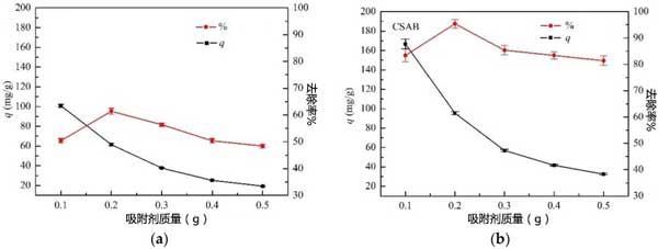 圖2:吸附劑用量對柴油吸附的影響:(a)炭化原料(b)活性炭。