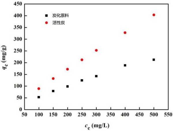 吸附等溫線:吸附等溫線對于描述溶質(zhì)如何與吸附劑相互作用非常重要,并且對于優(yōu)化吸附劑的使用至關(guān)重要。Langmuir等溫線假定單層吸附在含有均勻策略和吸附的有限數(shù)量的吸附位點(diǎn)的表面上,而在表面平面內(nèi)沒有吸附物的遷移。圖4顯示了柴油在所制備活性炭上的平衡吸附等溫線。從圖中可以看出,與炭化原料相比,活性炭的吸附等溫線更接近直線。隨著柴油溶液濃度的增加,活性炭對柴油溶液的吸附能力不斷增加。當(dāng)柴油濃度為500 mg/L時,活性炭達(dá)到最大吸附量。然而,當(dāng)柴油溶液濃度達(dá)到400 mg/L時,炭化原料的吸附容量增加緩慢?赡苁遣裼皖w粒覆蓋了材料的表面,導(dǎo)致吸附速率降低。從圖4中可以清楚地看出,活性炭的吸附能力明顯強(qiáng)于炭化原料。