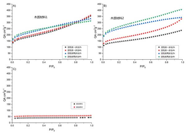 圖1:(A、B)兩種木質材料的一階段和兩階段活化(C)原材料碳化的吸附等溫線。