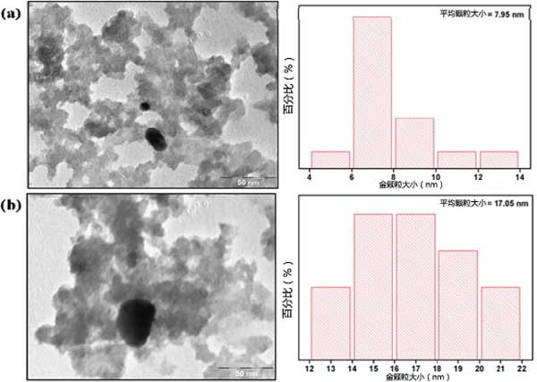 圖1:TEM圖像和直方圖比較4%金含量的活性炭催化劑。