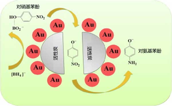 圖2:對硝基苯酚與對氨基苯酚與活性炭載金納米催化劑還原反應的示意圖。