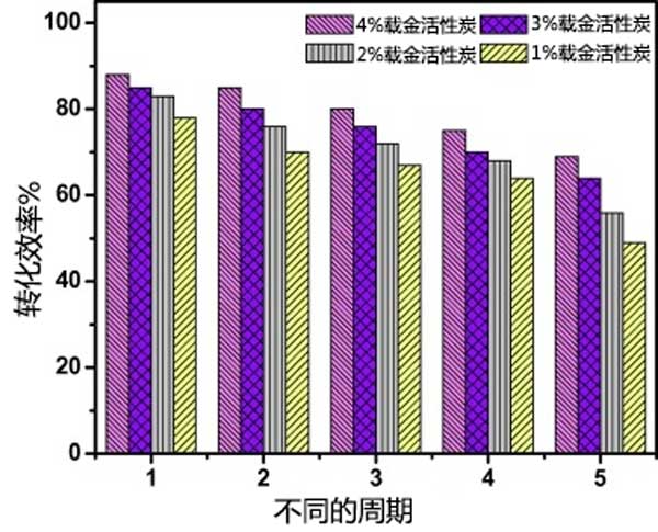為了量化活性炭載金催化劑的催化活性,可以使用轉換頻率作為度量。轉換頻率可以定義為使用每克活性炭每單位時間轉化成產物(對氨基苯酚)的反應物分子(對硝基苯酚)的數量。活性炭載金催化劑是可回收的,每次運行后,通過離心分離催化劑。即使使用5次,催化劑的轉化率最多降10%。這通過繪制百分比轉換效率與循環次數來顯示,如圖3示。
