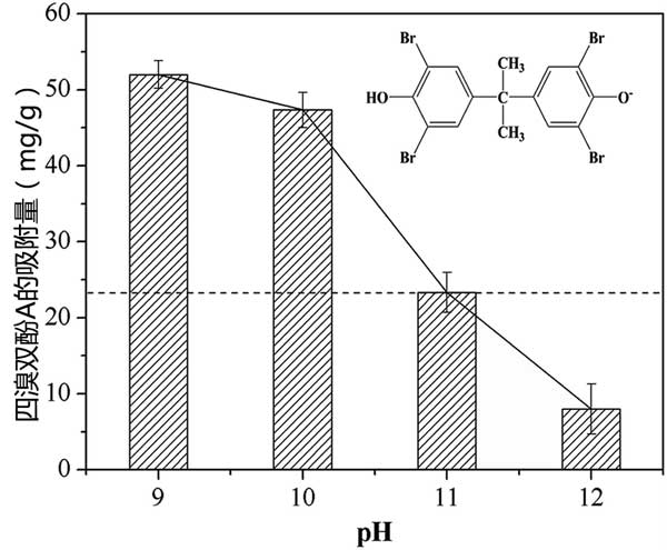 圖2:初始pH對用活性炭吸附四溴雙酚A的影響。