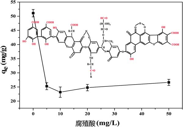 腐殖酸在通過死亡植物的微生物降解而衍生的天然水中普遍存在,其總是伴隨四溴雙酚A。因此,它的共存對四溴雙酚A的吸附效果是有影響的。根據四溴雙酚A在不同濃度腐殖酸下被活性炭吸附的結果(圖3),當腐殖酸濃度小于10mg L-1時,吸附容量顯著降低,而隨著腐殖酸濃度的持續增加,活性炭吸附四溴雙酚A增強。腐殖酸的基本結構是芳香環和脂環環,與羧基,羰基,醌基,羥基和甲氧基連接。所有這些結構都可以形成π-π相互作用,與活性炭形成氫鍵,這可能是由于腐殖酸和四溴雙酚A在活性炭上的競爭性吸附,從而降低了四溴雙酚A的去除效率。高濃度腐殖酸吸附的輕微增加可能是由于游離四溴雙酚A吸附到吸附到活性炭表面的腐殖酸。
