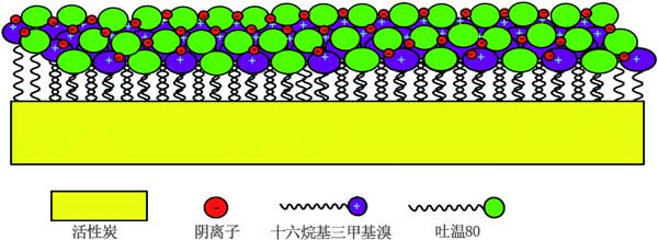 用表面活性劑改性的活性炭在電吸附過程中具有潛在的應用,其中表面電荷和潤濕性起重要作用。用離子表面活性劑功能化的活性炭電極最近在電容去離子技術,特別是反向電容去離子系統中引起了相當大的關注。圖3表明在用吐溫80和HDTMA的二元混合物改性的活性炭上吸附陰離子。吐溫80的存在表明HDTMA的吸附密度增強,完美填充(高穩定性),這在電吸附過程中都是值得的。實際上,HDTMA的增強的吸附密度誘導了陰離子污染物的高吸附能力。此外,改進的填料賦予表面活性劑在表面上的穩定性。這些特殊效果是混合表面活性劑體系應用的最終目標之一,為了提高活性炭的表面活性,對于單一表面活性劑體系來說,這是不可能發生的。