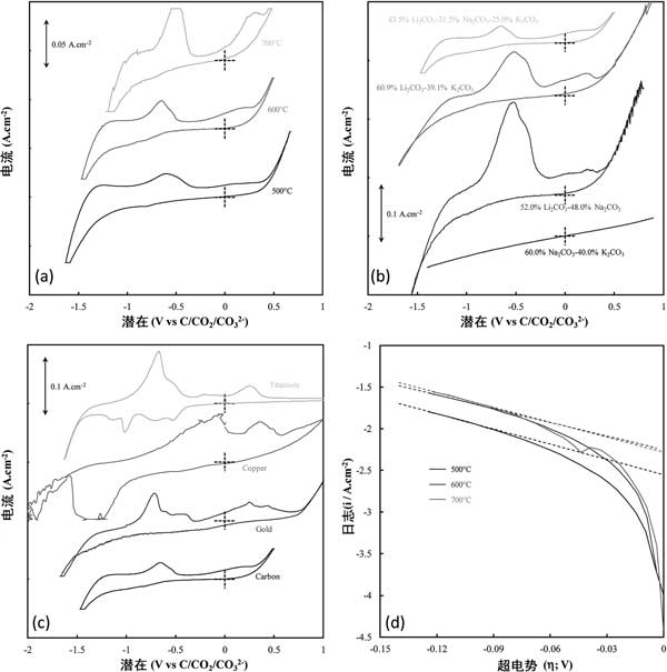 圖1:(a)活性炭的溫度,(b)發生沉積的熔融碳酸鹽電解質,以及(c)發生沉積的基板。(d)與在500-700°C的溫度下沉積的碳的碳沉積開始有關的Tafel峰的陰極Tafel曲線和計算的Tafel線(虛線)。