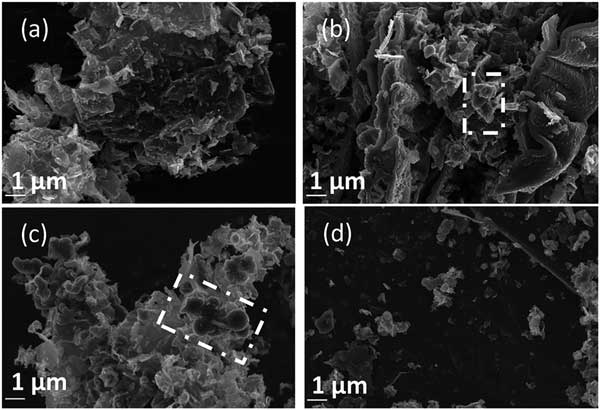 圖2:在其他標準條件下以20 kV放大倍數拍攝的碳沉積(a)0.15,(b)0.30,(c)0.60和(d)1.20 A cm-2時拍攝的SEM圖像。