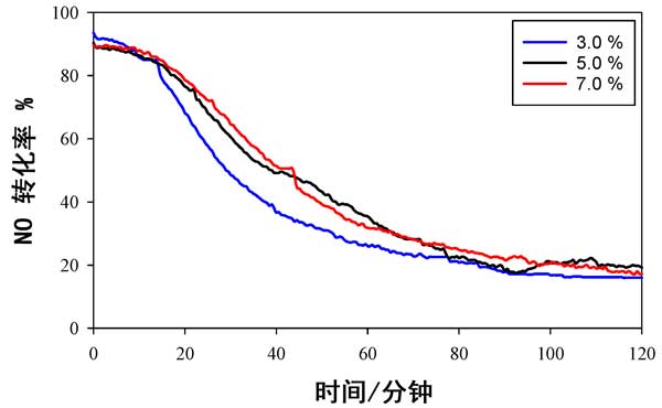 使用活性炭載錳氧化物催化劑時,不同溫度下NO轉化率數(shù)據(jù)與時間的關系如圖2所示。它用于提供可以與以前發(fā)布的數(shù)據(jù)進行比較的基線數(shù)據(jù)。在所有溫度(150°C,180°C和200°C)的前20分鐘內,幾乎有100%的NO轉化發(fā)生,但在此初始階段后NO轉化迅速下降,并且在2小時的測試后,轉化率不足20%;钚缘臏囟纫缽男砸来螢150°C>180°C>200°C。