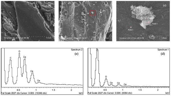 圖1: SEM和EDS分析結果:(a)酸洗活性炭的SEM,(b,c)負載鈰的活性炭的SEM,(d)點1的EDC,(e)第2點的EDS。