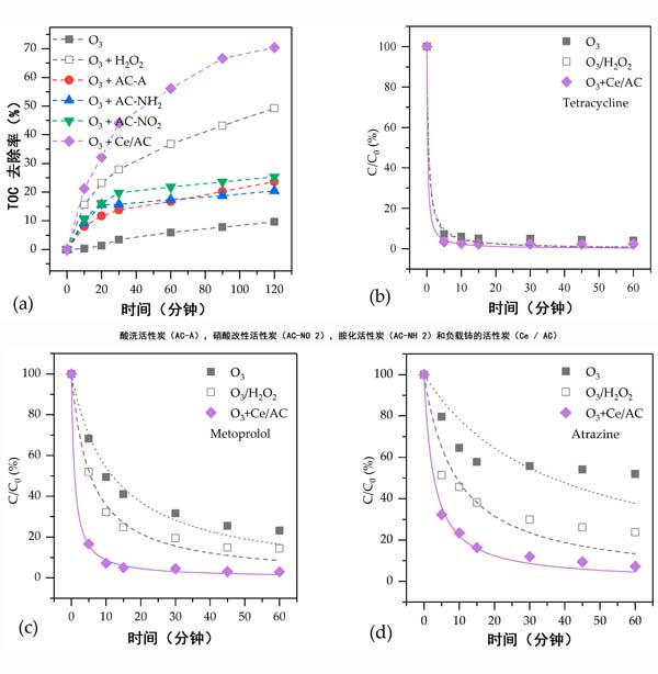 四種活性炭催化劑,例如酸洗活性炭,硝酸改性活性炭,胺化活性炭和通過改性和浸漬制備的載鈰活性炭。硝化和胺化分別提高了表面酸和堿性官能團的濃度,可以在一定程度上提高活性炭的活性。由于吸附,臭氧化和自由基氧化,在活性炭上負載鈰可以顯著增強活性炭催化臭氧化過程中水中有機化合物的去除。載鈰活性炭在水中對反滲透濃縮液催化臭氧氧化和有機化合物礦化方面非常活躍。它可以極大地刺激·OH的生成,這對于去除水中的難降解有機化合物起著重要作用。活性炭表面的官能團有助于生成·OH。此外,Ce 3+的氧化還原循環的組合Ce 4+和富電子結構與氧化鈰之間的電子轉移對于在載鈰活性炭表面快速連續地生成·OH非常有效。由于這些優點,載鈰活性炭是催化臭氧化的有前途的催化劑。