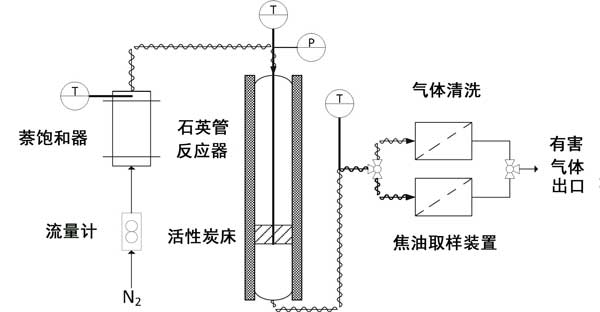萘轉(zhuǎn)化試驗(yàn)已在圖1所示的實(shí)驗(yàn)設(shè)備中進(jìn)行,該設(shè)備顯示了其主要部分:進(jìn)料系統(tǒng),反應(yīng)器,采樣/清潔裝置和氣體分析儀。進(jìn)料系統(tǒng)由用于調(diào)節(jié)氮?dú)饬髁康霓D(zhuǎn)子流量計(jì)和萘飽和器組成,以獲取摻有焦油的物流。飽和器和反應(yīng)器之間的管道應(yīng)保持在150°C以上,以免萘發(fā)生冷凝。所使用的反應(yīng)器是內(nèi)徑為14 mm,總高度為600 mm的立式管狀石英反應(yīng)器。將活性炭床放在反應(yīng)器內(nèi)部的玻璃粉上方,該玻璃粉位于距頂部430毫米處。床的溫度通過K型熱電偶在床的中央進(jìn)行測(cè)定。在焦油采樣期間,通過切換三通閥,將反應(yīng)器出口處的氣體導(dǎo)入采樣裝置,并在其余時(shí)間內(nèi)導(dǎo)入清潔裝置。采樣裝置由三個(gè)撞擊器組成,在0°C時(shí)充滿異丙醇。專用實(shí)驗(yàn)表明,在本研究分析的條件下,該設(shè)備的捕獲效率超過99%。借助帶有熱導(dǎo)檢測(cè)器(TCD)的微型氣相色譜儀分析清潔區(qū)出口處的氣體,以在線測(cè)定短鏈烴(從乙炔到苯)和分子氫。實(shí)驗(yàn)裝置的更多詳細(xì)信息可以在其他地方找到。