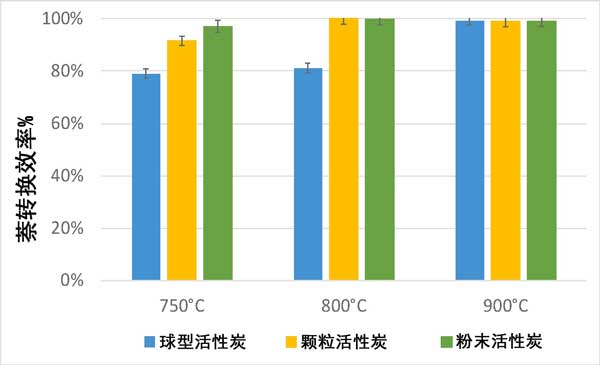 圖2:用活性炭球型、顆粒和粉末在750°C,800°C,900°C下獲得的萘轉(zhuǎn)化率以百分比表示,并帶有標(biāo)準(zhǔn)偏差的表示。