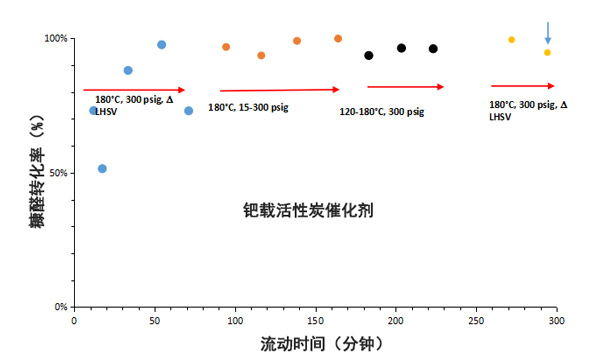 圖1:使用活性炭催化劑進行糠醛加氫的生產時間分析,箭頭表示將乙酸添加到進料中的實驗。