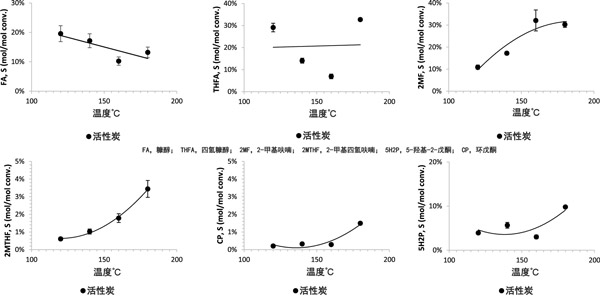 由于使用活性炭整料進行糠醛連續氫化以合成糠醇,四氫糠醇和環戊酮的工作很少,我們希望確定溫度和壓力對選擇性和時空產率或轉化率的影響。因此,在一組實驗中,采用活性炭催化劑來確定溫度對糠醛氫化的影響。在所有溫度下,活性炭整料的糠醛轉化率均高于90%。活性炭整料的高碳封閉率是在180°C時達到的(約90%)。升高溫度會降低糠醇的選擇性,并提高除四氫糠醇以外的所有產品的選擇性(圖2)。
