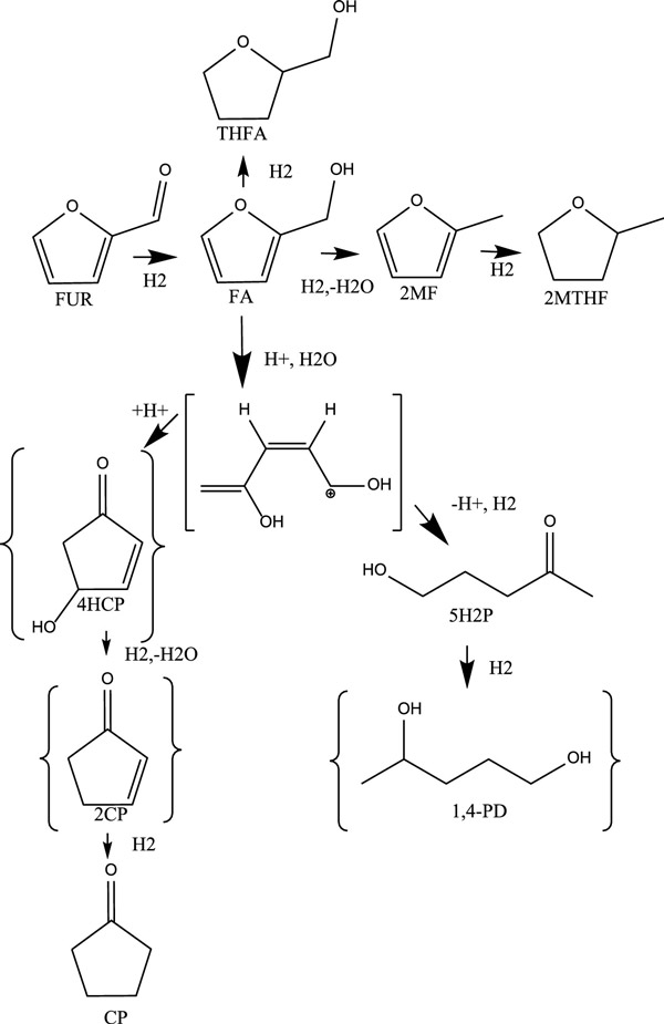 在下一組實驗中,確定了液體停留時間對糠醛加氫超過0.8%活性炭催化劑的影響(H 2氣流保持恒定在100 mL/min)。糠醛轉化率隨著液時空速的增加或停留時間的縮短而下降,碳封閉率在74%至100%之間。溫度,壓力和液體停留時間效應研究的結果表明,活性炭催化劑主要通過糠醛促進了糠醛中糠醇和2-甲基呋喃的形成,并通過推測性反應途徑促進了環戊酮和5-羥基-2-戊酮的少量形成,需要對酮進行酸催化)形成(圖3)。