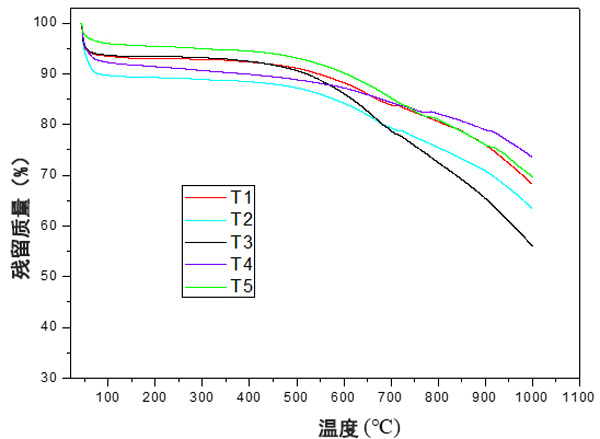 根據圖3,不同的處理導致熱分解曲線有所不同。此外,不同處理的殘留質量也有所不同,處理T1,T4和T5呈現更高的殘留質量,表明這些處理具有更高的耐熱性。處理T2和T3的殘留量較低,表明處理的耐熱性較低。此外,這些處理在后期殘留質量之間存在重大差異而脫穎而出。根據處理(電擊時間),降解曲線的差異可能與表面上不同官能團的存在有關。在熱過程中,由于存在的官能團,會形成不同的產物,從而導致更高或更低的質量損失,因為活性炭的熱分解反應了其表面上官能團的存在。然后,官能團的類型和數量都會影響熱重曲線。但是,由于表面官能團的降解與其結構不同,因此官能團的類型具有更大的影響,并且可以解釋處理之間的差異。