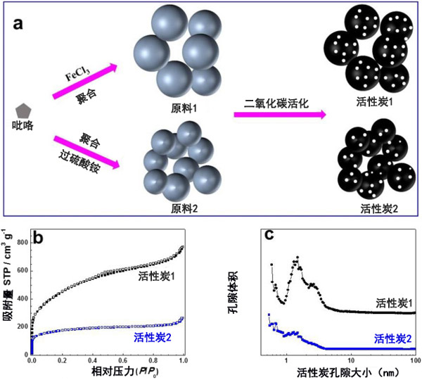圖1和一個示出了活性炭材料的制備方法。首先,使用不同的氧化劑(FeCl 3和過硫酸銨)通過吡咯單體的氧化聚合反應合成了兩種樣品。其次,對原材料進行二氧化碳活化處理,以制備具有高孔隙率的活性炭。進行氮吸附測量以獲取關于他們的比表面積的數據。