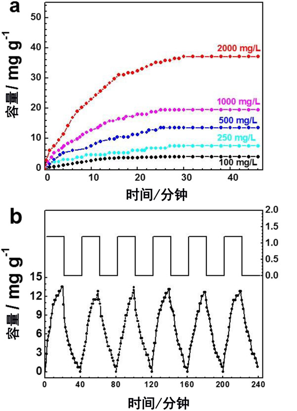 圖3:(a)在不同的NaCl濃度下活性炭的電吸附動力學,(b)活性炭電極在NaCl電解質中的電吸附和再生循環。