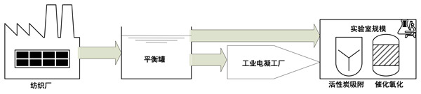 來自紡織廠的紡織廢水被存儲在均衡罐中,并轉(zhuǎn)移到工業(yè)規(guī)模的電凝處理廠。此后,如圖1所示,在實驗室中進行了催化臭氧氧化,然后進行了吸附階段。單次吸附:在催化臭氧氧化之前,對于所有催化劑,吸附實驗均進行了30分鐘。將活性炭催化劑直接添加到廢水中。吸附在與臭氧化處理相同的反應器中進行,但沒有臭氧入口以維持均勻的實驗條件。所有實驗條件與臭氧化處理期間相同。溫度保持穩(wěn)定并且等于23±1℃。活性炭催化臭氧化:使用與吸附和臭氧化相同的反應器進行催化臭氧化。所有實驗條件與臭氧化處理期間相同。對于所有催化劑,每次催化劑濃度為0.5g/L。反應后,進行催化劑的過濾(0.45μm過濾器)。