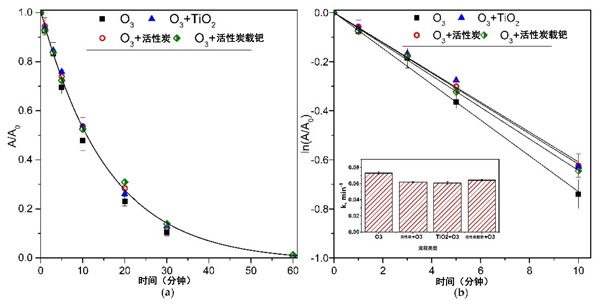 圖2:使用三種類型的催化劑(a)和擬除色率(b)進行臭氧氧化和催化臭氧氧化處理期間的原始(未經(jīng)預處理)工業(yè)廢水。
