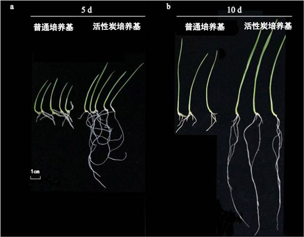 圖1:圖像顯示在活性炭或普通培養基中生長5天(a)或10天(b)的小麥幼苗。