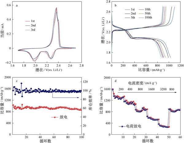 為了評估活性炭作為陰極的電化學(xué)性能,將鋰箔作為陽極組裝到鋰硫電池的紐扣電池中。用于第一,第二和第三個循環(huán)的循環(huán)伏安圖(CV)曲線上在0.05毫伏·秒的掃描速率的電位窗口進行(圖2A)。在第一循環(huán)期間,觀察到兩個陰極峰在2.26和1.97 V,CV曲線中最初的幾個循環(huán)幾乎重疊,這表明循環(huán)穩(wěn)定性極佳,容量保持率相對較高。活性炭的恒電流充電/放電曲線和循環(huán)穩(wěn)定性的測試中,如在圖中所描述2B、C。活性炭電極的首次放電容量為1045 mAh·g -1,約為硫理論容量的62.5%。此外,活性炭電極在第100次循環(huán)時也顯示出869.8mAh·g -1的放電容量。如圖2d所示測量活性炭的倍率性能,在200–3200 mA·g -1下表現(xiàn)出1260、1050、806、513、290 mAh·g -1的可逆放電容量。此外,當(dāng)電流密度達到800 mA·g時,活性炭陰極的放電容量為802 mAh·g -1。多孔活性炭材料表現(xiàn)出中等的鋰硫電池電化學(xué)性能,顯示出高性能鋰硫電池的潛力。