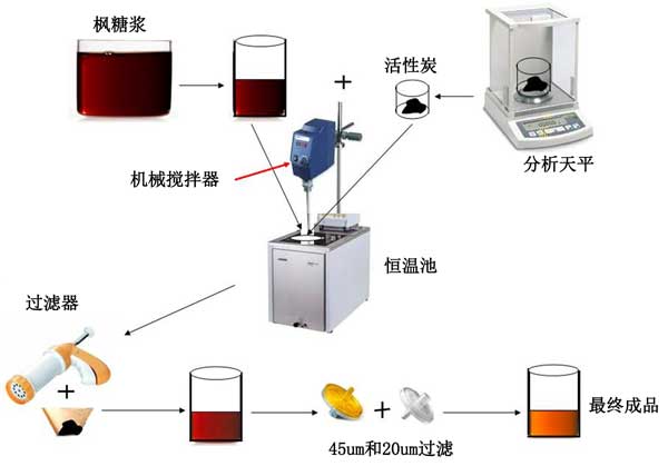 根據實驗測試活性炭使黑楓糖漿變色的機制,使用食品級活性炭作為吸附材料,以改善深色楓糖漿的顏色和氣味/味道,從而生產與淡糖漿或琥珀色糖漿。圖1說明了該測試中使用的變色過程。為了進行實驗,我們使用了不同量的活性炭(0.01、0.03和0.05 g),并引入10 mL楓糖漿樣品中,以得到0.1、0.3和0.5g/100 mL的最終濃度。然后,將混合物放入恒溫池中,以便通過使用電動攪拌裝置來調節工作溫度和攪拌速度。攪拌(混合)時間設置為20、40和60分鐘。在混合時間結束時,首先通過使用簡單的紙過濾器過濾混合物,以去除使用過的活性炭的大顆粒。通過使用兩個分別具有45和20μm的篩孔尺寸的注射器過濾器進行第二次過濾。