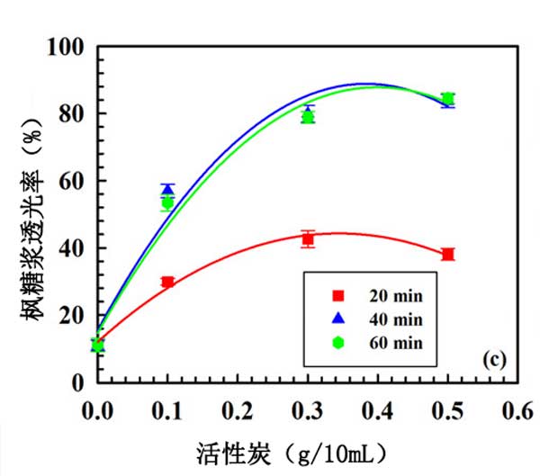 楓糖漿透光率隨混合時間和添加的活性炭濃度的變化。楓糖漿的透光率隨活性炭混合時間(20、40和60分鐘)的變化(活性炭類型不同)而變化如圖3所示。獲得的結果表明,活性炭通過使用40分鐘的處理時間,吸附動力學達到了最大值。在這種情況下,獲得的最大透光率為83.70±0.21%。此后,吸附達到飽和。但是,在固定使用濃度的活性炭下,混合時間的影響在20分鐘的處理中最低。混合40至60分鐘之間未觀察到明顯差異。