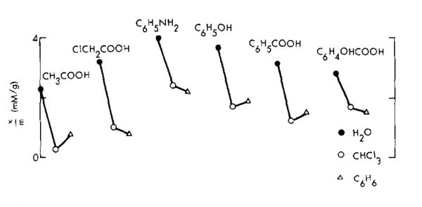 通過測量水,氯仿和苯中溶液對乙酸,一氯乙酸,苯甲酸,苯酚,苯胺和水楊酸的吸附,研究了溶劑極性的影響。活性炭的結果如圖2所示。-Cl在乙酸分子中的吸附總是增加,但是在有取代苯的情況下,吸附順序是