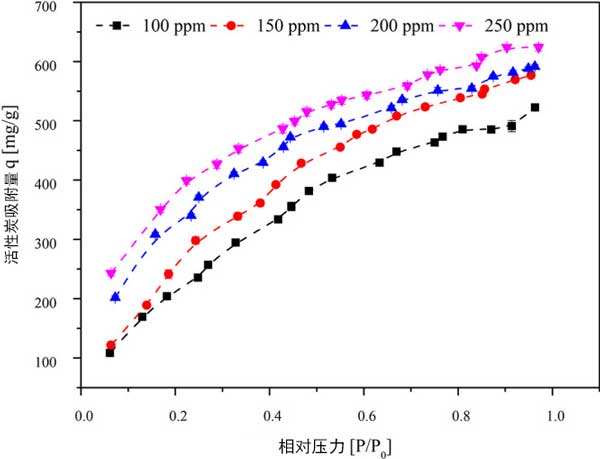 為了確定三氯乙烯初始濃度在進料流中的影響,研究了100、150、200和250ppm的濃度。維持其他實驗條件,活性炭顆粒大小為355μm,床溫為30°C,活性炭重量為50mg。入口濃度為100、150、200和250ppm時的吸附容量分別為523.252、575.844、593.181和624.044mg/g。隨著入口三氯乙烯濃度的增加,在壓力增加的情況下,活性炭的吸附容量顯示出穩定的增加。在較高濃度下,隨著壓力的增加,吸附容量的增加可能是由于相鄰分子與微孔中的層內分子粘附所致。這導致形成粘附在吸附劑表面上的層內分子的相鄰三氯乙烯分子堆疊。三氯乙烯分子的平面形狀的動力學直徑為6.6。因此,它會積聚在活性炭的微孔/中孔上。在活性炭的微孔區域中具有大孔體積的情況下,假設縫隙形狀的孔幾何形狀,則期望對活性炭上的三氯乙烯具有高親和力。在低濃度(0-8000μg/L)的活性炭上進行了三氯乙烯的吸附,在室溫下吸附量為160mg/g。