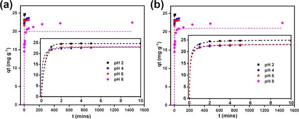 圖2:通過非線性(a)偽一階模型和(b)偽二階模型擬合在4、2、4、6和8的四個不同溶液pH下的實驗吸附動力學數據。實驗數據用點表示,等溫線擬合用虛線表示。