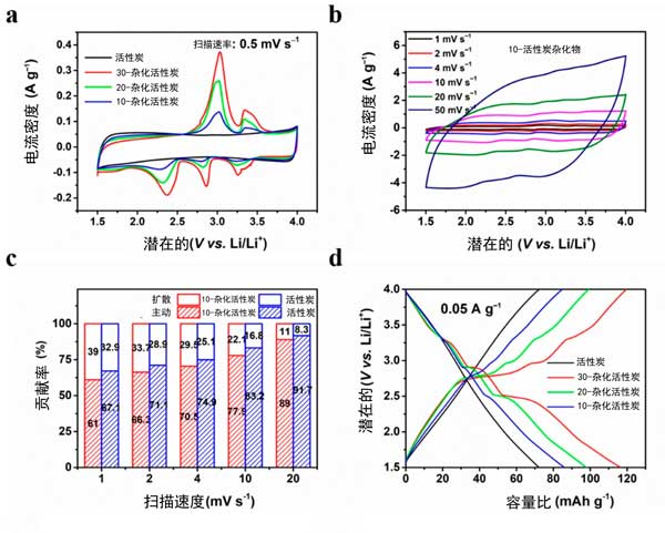 圖2:活性炭和活性炭雜化物在1.5至4V的半電池測試中的電化學性能。(a)所有樣品在0.5mV s-1的掃描速率下的循環伏安(CV)曲線,(b)活性炭雜化物1至50mV s-1之間的不同掃描速率下的CV曲線,(c)活性炭雜化物的擴散控制法拉第過程和電容過程的貢獻率,(d)在0.05A g-1的電流密度下所有樣品的恒電流充/放電(GCD)曲線。