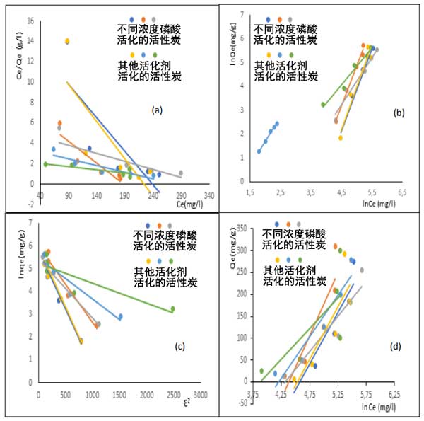 圖3:根據Langmuir(a),Freundlich,(b)條件D-R-K,(c)和Temkin,(D)苯二胺在活性炭上的吸附等溫線。
