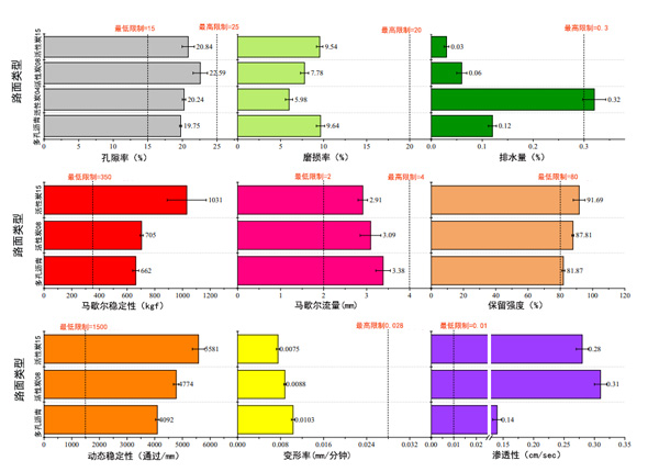 圖2:活性炭和多孔瀝青的調節性能(空隙,磨耗,排水,馬歇爾穩定性,馬歇爾流量,保留強度,動態穩定性,變形率和滲透性)的比較。