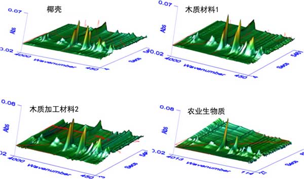 圖1:四種生物質樣品熱解過程中氣態產物的3D FTIR吸收光譜。